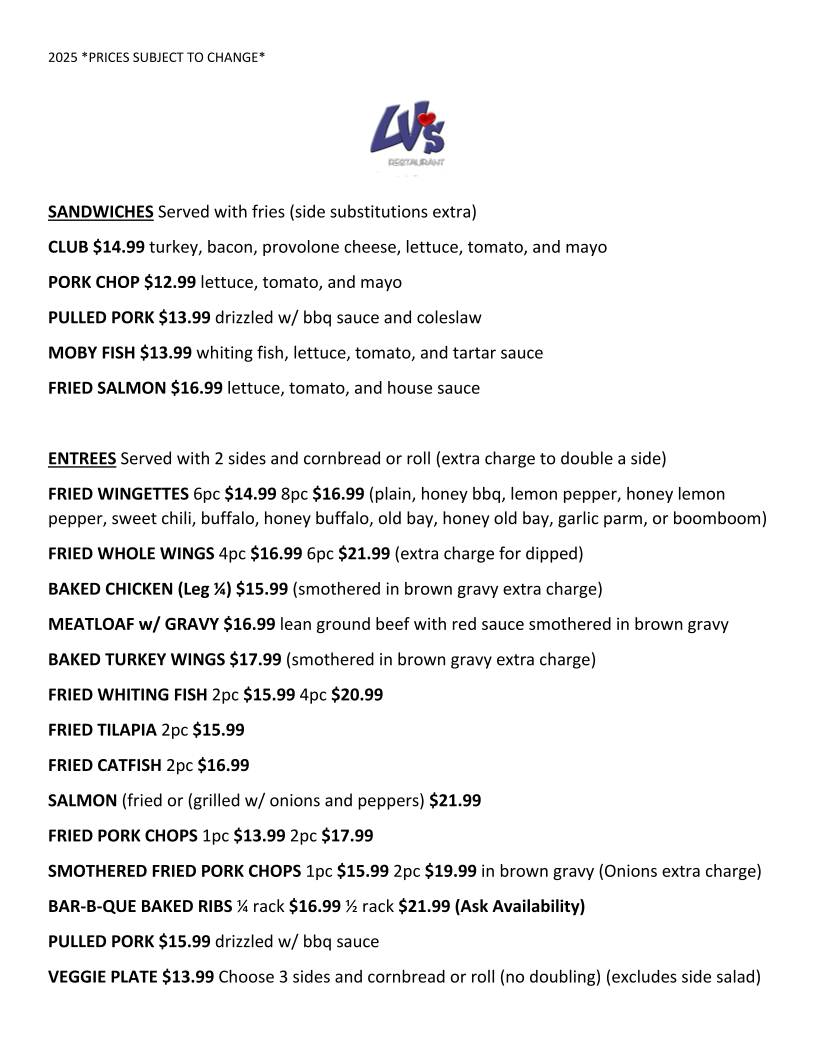 LV's Restaurant Menu