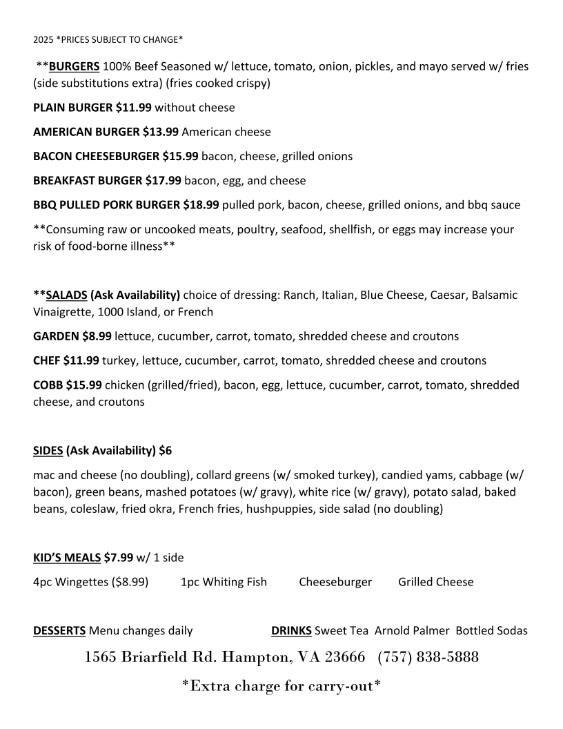 On the menu, you’ll find soul food staples like fried fish dinners with mashed potatoes and collard greens, chicken and waffles, and meatloaf alongside satisfying bar bites such as chicken wings and baby back ribs. For something a little different, the Wings Mac and Cheese or Fish Cabbage Mac and Cheese offer a comforting twist on familiar favorites.